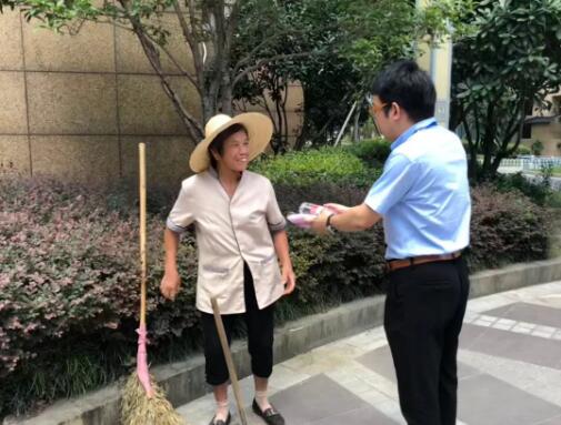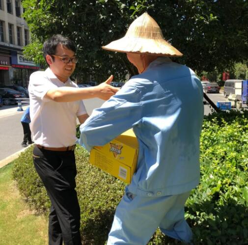7月16日、17日,公司总经理陈铬带领各职能部门负责人,顶着高温炎热,亲临义桥、萧山等区域各项目“送清凉”活动,将冰红茶、哇哈哈矿泉水和毛巾送到一线员工手中,嘱托各管理处负责人要强化员工防暑降温知识宣传教育,提高员工自我保护意识和能力。中午,陈总还特意来到员工食堂,要求各项目一定要做好食堂的饮食安全和清洁卫生工作。