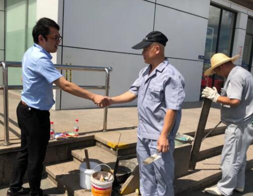 陈总一把握住正在广场修复地面工程人员的手,递上擦汗的毛巾和甘甜的纯净水,这份关怀犹如夏日里的丝丝凉风,沁人心田。
