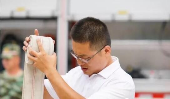 工作人员现场演示了消防水带的展开连接、水枪救火、灭火器扑灭火苗、安全撤离等虚拟火灾情况。