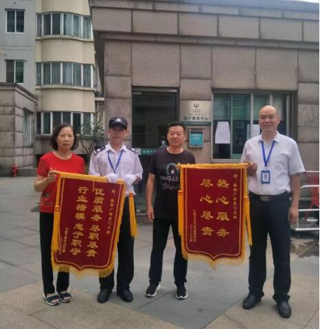 图为业主为绿都世贸广场的物业工作人员送上锦旗。